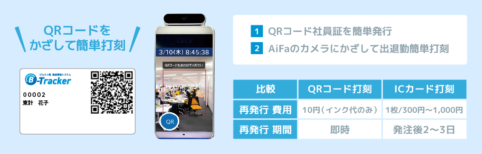 QRコード社員証を簡単発行。AiFaのカメラにかざして簡単に出退勤打刻。
